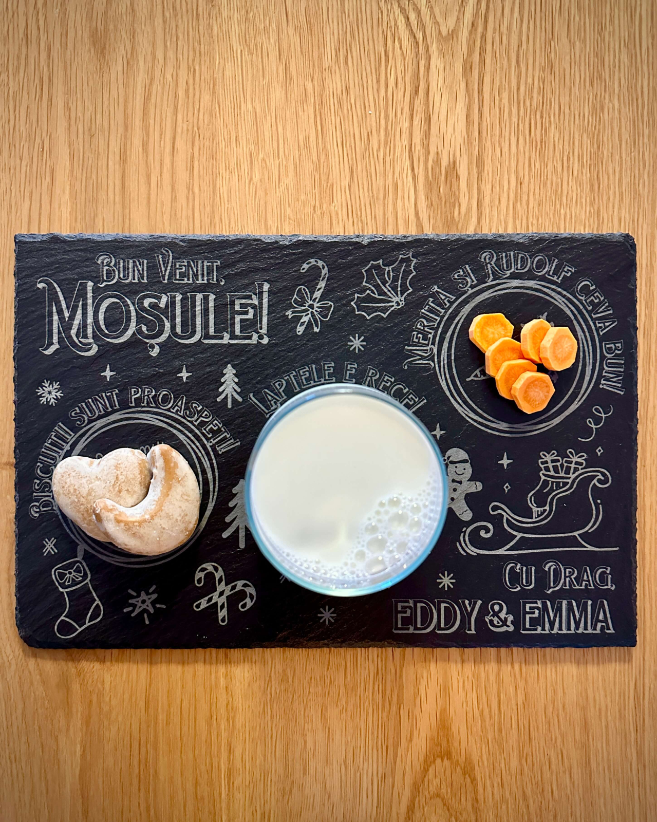 Acest platou ardezie gravat transformă cea mai frumoasă tradiție de Ajun într-un moment de neuitat. Dacă familia ta lasă prăjituri, lapte și morcovi pentru Rudolf sub brad, acest produs este piesa centrală care îți lipsea.